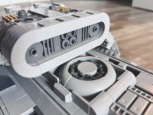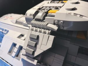 Was mich allerdings komplett fertig macht, ist die Qualität der Steine. Hier wurden Xingbao-Bricks verwendet und das war, so finde ich, das übelste, was man diesem Set antun konnte. Ist es bei den Hinges (siehe Bild 3 von oben) noch so, dass diese sich fast beinahe kaum verstellen lassen, so fest und stabil sind sie, so wird man im Gegenzug sein graues blaues Wunder erleben, wenn es um die nicht vorhandene Klemmkraft diverser anderer Teile geht. Ist das Modell einmal aufgebaut und platziert, macht es wirklich was her. Will man es aber mal in die Hand nehmen, umstellen oder gar öffnen, um sich den Innenraum anzusehen, purzeln einem im Grunde bei jeder Bewegung die Bricks entgegen. Das war nicht nur beim Zusammenbau eine harte Nervenprobe, sondern sorgt auch jetzt noch für Unmut, wenn man das Teil mal zum Abstauben aus dem Regal nimmt. Kurioserweise ist die Situation beim großen, klingonischen Bird of Prey, der ebenfalls aus Xingbao-Teilen besteht, eine fast komplett andere. Auch hier gibt es einige wenige Teile, die man ohne Mühe vom Modell entfernen kann. Das einem aber Teile schon beim bloßen Anschauen entgegenregnen, wie es beim Runabout tatsächlich der Fall ist, kann ich nicht bestätigen.